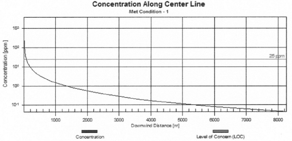 In graficul urmator se prezinta evolutia concentratiei amoniacului in aer functie de distanta de sursa de emisie iar zonele afectate sunt prezentate grafic in Anexa IVBIV 2.