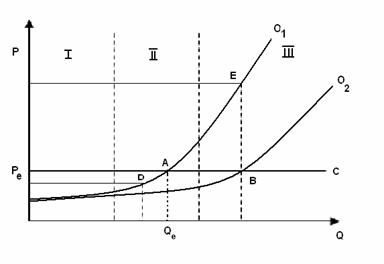 daca se doreste marirea cantitatii de colectat prin extindere in zona III, in conditiile pastrarii pretului (punctul B), devine necesara modificarea ofertei din O1 si O2;