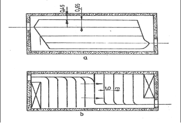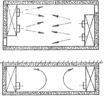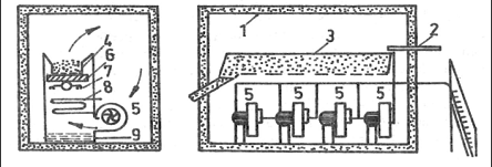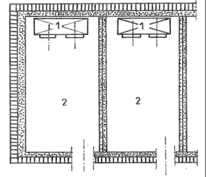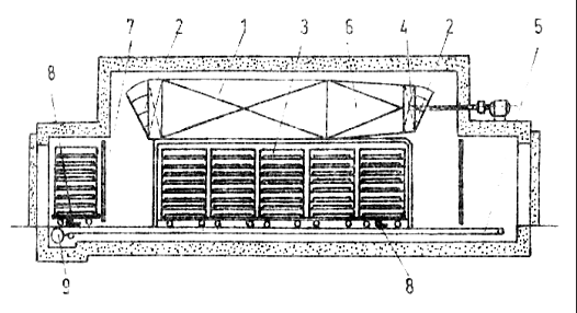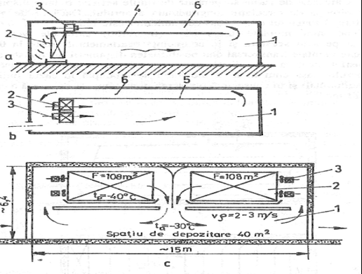 In figura este prezentat un sistem de congelare in celule, cu circulare longitudinala a aerului.