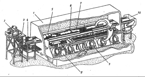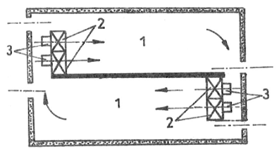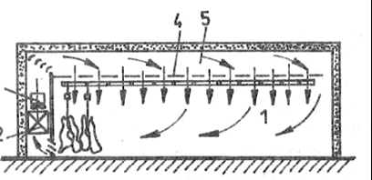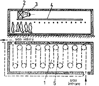 In figura este reprezentat un tunel de congelare cu circulatie longitudinala a aerului, utilizat pentru congelarea in flux continuu a carcaselor de carne suspendate de carlige cu role, care se deplaseaza pe caile aeriene de rulare tractate de un conveier cu lant.