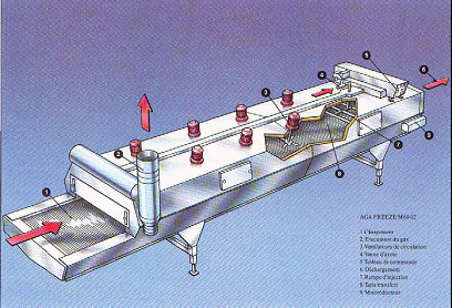 Aparatele de congelare in strat fluidizat cu banda transportoare, au banda transportoare cu viteza reglabila, realizata din sarma de otel inoxidabil. In imagine este prezentat un asemenea aparat produs de firma Lewis.