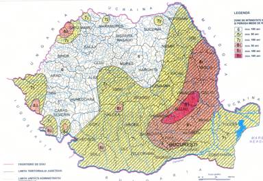 Zone de intensitate seismica pe scara MSK si perioada de revenire 6 - cca. 100 ani 7/1 - cxca. 50 ani 7/2 - cca 100 ani 8/1 - cca 80 ani 8/2 - cca 100 ani 9/2 cca 100 ani |
