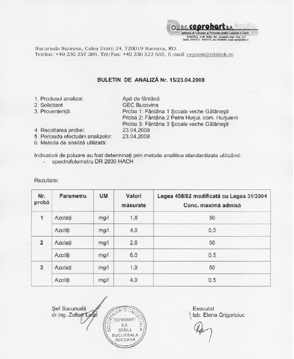 Calitatea apei din fantani. Analizele efectuate au evidentiat depasiri importante ale concentratiei nitritilor in probele analizate, respectiv: apa din fantana din incinta Scolii cu clasele I - IV - Galanesti, fantana din gospodaria cetateanului Petre Hurjui, Hurjuieni si fantana din incinta Scolii gimnaziale din Galanesti. Din analiza rezultatelor se constata ca toate cele 3 probe corespund din punctul de vedere al indicatorului azotatii, concentratiile determinate fiind sub valoarea maxima admisa de legislatia in vigoare, in schimb azotitii sunt de in concentratii mult peste limita admisa.