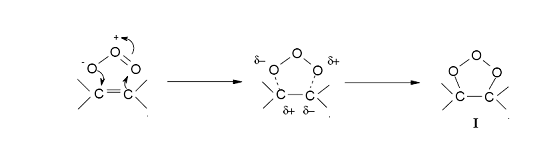 Aceasta structura foarte reactiva genereaza in reactiile sale o serie intreaga de forme activate ale oxigenului (ROS - reactive oxygen species = specii de oxigen reactiv, denumite impropriu si radicali liberi). In sistemele biologice ozonul reactioneaza cu toate legaturile duble din lanturile de carbon: