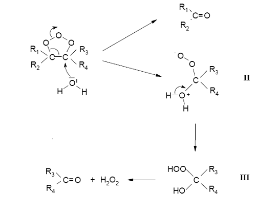 Peroxidul format este instabil in solventi protonati (ca apa) si se descompune cu formarea unor ceto-derivati si a apei oxigenate (prima specie moleculara dintr-o lunga serie de specii moleculare reactive ale oxigenului):