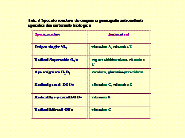 Deci ozonul este foarte distrugator pentru structurile celulare cu care contin legaturi duble in lanturile de carbon (si in special membrane celulare si acizi nucleici). Pentru a contracara actiunea distrugatoare a ozonului (si a ROS generate din actiunea ozonului) sistemele biologice si-au dezvoltat o serie intreaga de mecanisme de protectie, in care sunt folositi anti-oxidanti specifici. In tab. 2 sunt prezentate acesti anti-oxidanti