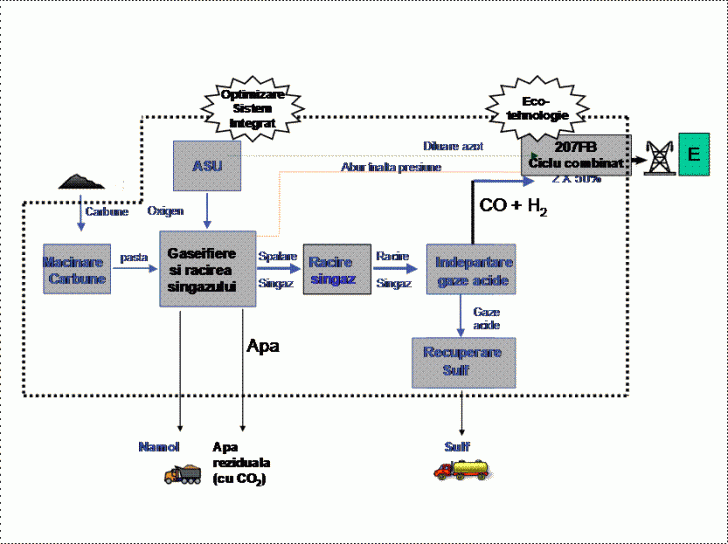 Sulful se separa prin racire, iar gazul de sinteza se arde in turbine cu gaz pentru a se genera curent electric. Caldura reziduala de la turbinele cu gaz se foloseste pentru producere de abur, iar aburul se apoi se foloseste pentru producerea de energie electrica.