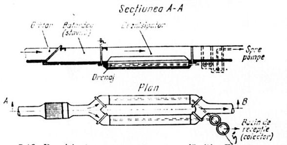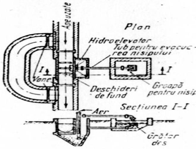 Evacuarea apei deznisipate se face printr-un orificiu decupat in timpanul aval.