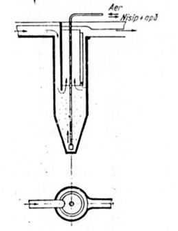 In miscarea lui descendenta, nisipul intalneste peretele tronconic (inclinat cu unghiul β=30 fata de orizontala) si se prelinge in zona inferioara de colectare a nisipului.