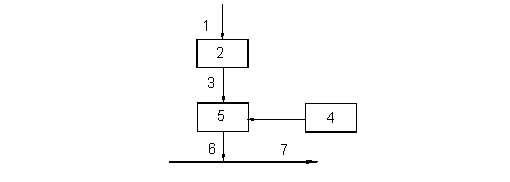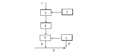 1 - ape uzate; 2 - epurare mecanica; 3 - ape decantate; 4 - statie de preparare si dozare; 5 - bazin de amestec si reactie; 6 - efluent;7 - emisar.