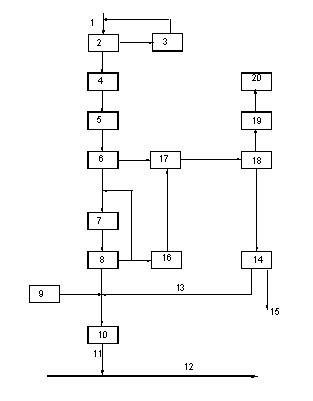 1 - influent (ape uzate); 2 - gratar; 3 - deznisipator; 4 - dezintegrator; 5 - separator de grasimi; 6 - decantor primar; 7 - bazine de aerare cu namol activ; 8 - decantor secundar; 9 - instalatie de clorinare; 10 - bazin de contact (efluent); 11 - ape epurate; 12 - emisar;13 - ape de drenaj; 14 - platforme de uscare namol; 15 - namol spre valorificare; 16 - concentrator de namol; 17 - statie de pompare namol; 18 - rezervor de fermentare metanica; 19 - rezervor de gaze; 20 - centrala termica.