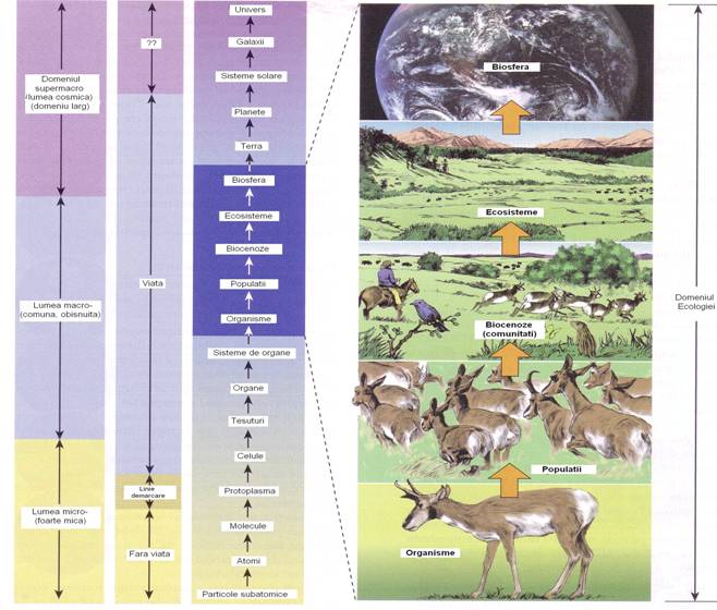 Poate insa ca niciunde mai bine decat in lumea vie, in totalitatea sa, biosfera, formeaza un spectrum continuum de unitati structurale, functionale, si cu complexitate progresiva (Odum, 1993). Din punct de vedere biologic masa biotica prezinta 9 nivele de integrare si organizare (celula este considerata ca o unitate structurala si functionala fundamentala a viului). Organismul este forma superioara de organizare a materiei la nivel biologic, dar in acelasi timp el este si unitate structurala si functionala fundamentala a ecosistemului. Din punct de vedere ecologic sunt semnificative 5 nivele de ierarhizare (Fig. 2-2).