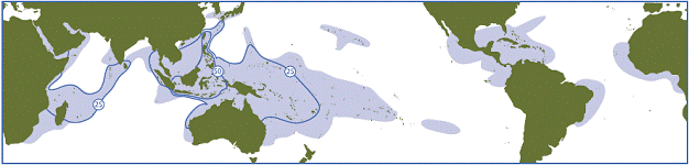 Fig. 1 Distributia generala a recifelor de corali, contururile indicand numarul de genuri. Arealul din interiorul conturului cu 50 de genuri este "triunghiul coraligen" - centru biodiversitatii coraligene din sud-estul Asiei. Arealele albastre in afara contururilor, reprezinta regiuni cu cel putin 10, dar mai putin de 25 de genuri.