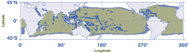 puternic afectate intre anii 1997-1998, de albirea coralilor. Raspandirea