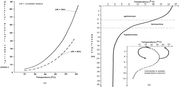 Fig. 2-17. Relatia dintre puterea de evaporare a aerului (masurata prin deficitul presiunii vaporilor) si temperatura. Evaluare pentru 2 tipuri de umiditate relativa (a); Stratificarea termica la nivelul unui lac (cazul lacului Pavin, Franta) (b) (dupa Faurie si colab. 1998; dupa Fritschen si Gay 1979; din Brewer 1988).