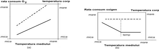 Relatia dintre organisme si mediu este diferita la homeoterme, comparativ cu poikiloterme (Fig. 2-10). Asociat cu cresterea temperaturii mediului crestere rata metabolismului si productia de caldura la poikiloterme, dar scad cele doua procese la homeoterme.