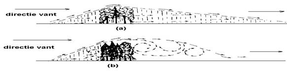 Fig. 2-39. Bariere de protectie si modelarea curentilor de aer. (a) - perdele moderat consistente si penetrabile; (b) - perdele consistente care modifica viteza, directia si forma curentilor de aer (dupa Faurie si colab.