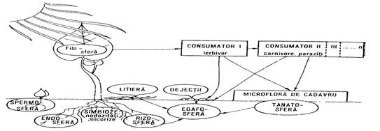 "Sferele" de la nivelul solului. Solul este deci un "organism viu si complex". La nivelul sau exista structuri diverse, determinate de prezenta radacinilor plantelor, a resturilor organice, a substantelor minerale, a microorganismelor, a semintelor care incoltesc si cresc, a actiunii pedofaunei etc. Papacostea (1976) ilustreaza sugestiv aceasta complexitate prin definirea unor sfere de activitate si complexitate (rizosfera, tanatosfera, semiosfera) (Fig. 2-42).