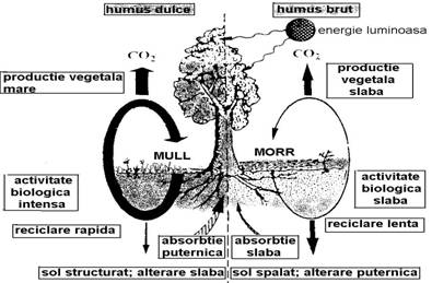Fig. 2-43. Reprezentarea schematica a procesului de reciclare a materiei organice intr-un ecosistem natural (ex. padure), dependent de pH-ul solului si existenta celor doua categorii de humus (morr si mull) (dupa Toutain 1971; din Faurie si colab. 1998).