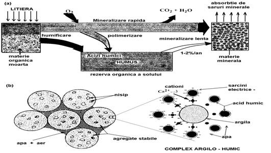 Fig. 2-44. Reprezentarea schematica a proceselor de mineralizare si humificare a solului (a) si constituirea agregatelor stabile, din complexele argilo-humice in procesul de humificare (b) (dupa Tavernier 1987)