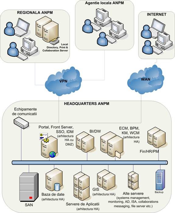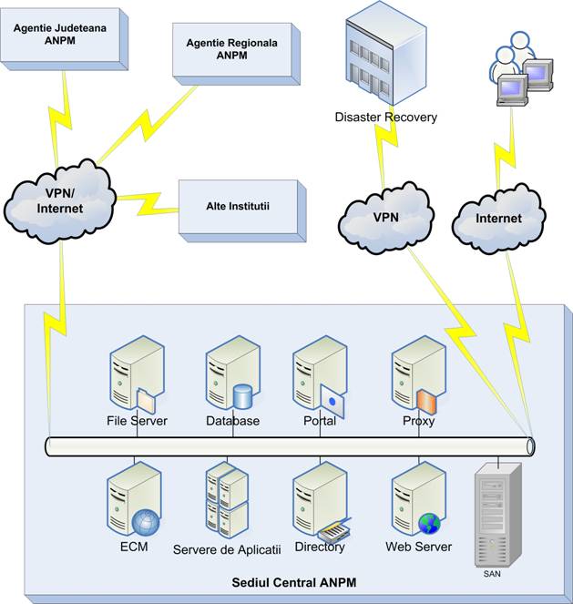 Serviciile gazduite in sediul central ANPM au rolul de a colecta informatiile din teritoriu si de a le agrega in vederea prezentarii situatiilor analitice complete despre situatia din tara. Este evident astfel ca aceste servicii trebuie sa fie functionale 100% din timp, fara nici un fel de intreruperi, necesitind configurarea lor in arhitecturi de inalta disponibilitate (tip high availability). Mai mult, avand in vedere importanta ca acest nod sa functioneze si in caz de dezastru este necesara existenta unei solutii de backup pentru situatii de forta majora (dezastre, calamitati naturale), conectata la sediul central.