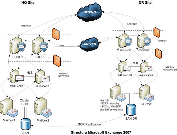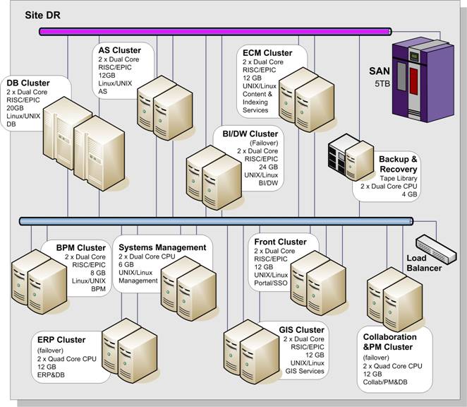 In figura urmatoare se pot vedea principalele componente ale infrastructurii hardware pe cele doua locatii: cea principala si cea de Disaster Recovery.