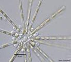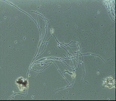 d) Bacterii filamentoase prezinta o componenta frecventa a flocoanelor de namol activat. Dezvoltarea excesiva a acestor bacterii formeaza o retea deasa de ochiuri in interiorul careia apa si aerul circula cu mare greutate ajungandu-se la o carenta de hrana si de oxigen care dauneaza si celorlalte microorganisme, cauzandu-le disparitia. Cand domina bacteriile filamentoase, eficienta de epurare exprimata in CCO si CBO5, este scazuta, iar biomasa nu decanteaza in clarificatorul final, se manifesta tendinta de plutire a namolului activ in decantoarele secundare. In namolul activ intalnim urmatoarele bacterii filamentoase : Sphaerotilus Natans - Fig 2.9 si Beggiatoa Alba - Fig.2.10.