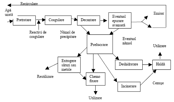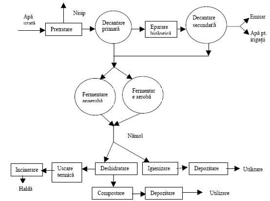 Epurarea apelor uzate, in vederea evacuarii in receptorii naturali sau a recircularii, conduce la retinerea si formarea unor cantitati importante de namoluri ce inglobeaza atat impuritatile continute in apele brute, cat si cele formate in procesele de epurare. Schemele tehnologice aplicate pentru epurarea apelor uzate industriale si orasenesti, din care rezulta namoluri se pot grupa in doua mari categorii: cele privind epurarea mecano-chimica si cele privind epurarea mecano - biologica. In fig. 1 si 2 se prezinta principalele surse de namol in cadrul schemelor de epurare mentionate.