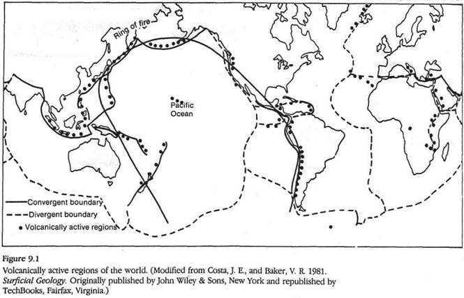 Vulcanii sunt de doua tipuri, hawaiian, caracterizat de magme fluide / activitate non-exploziva, si vulcani compusi (stratovulcani) / domuri vulcanice, cu magme vascoase / activitate exploziva. Vulcanismul se manifesta in general la contactul dintre placi, unde magma este produsa prin consum sau expansiune litosferica (fig. 9.1).