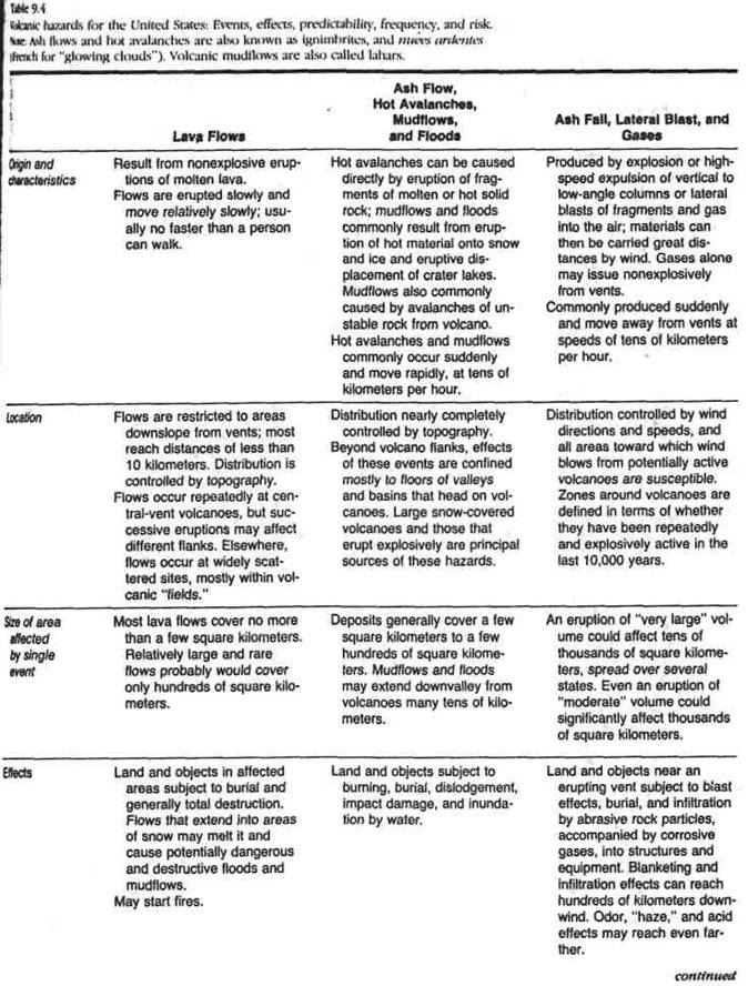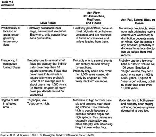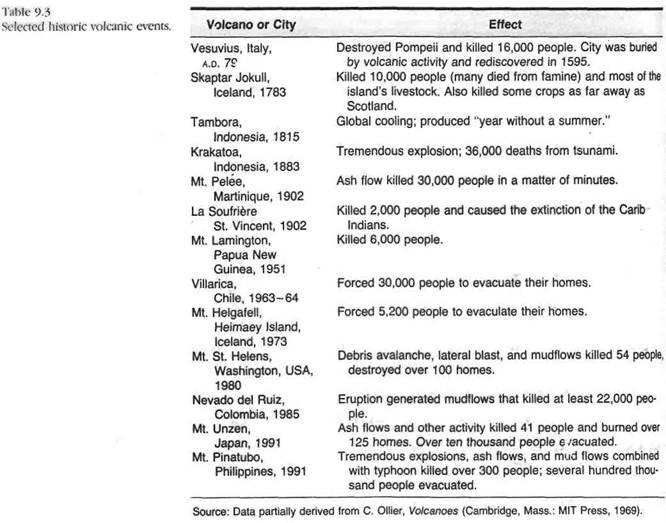 Eruptiile vulcanice au provocat mari distrugeri de bunuri si proprietati, au omorat si ranit oameni, reprezentand in continuare / perspectiva un potential pericol de catastrofa naturala (tabel 9.3). Efectele primare ale activitatii vulcanice includ curgerile de lave si manifestarile piroclastice. Efectele secundare includ curgerile de mal si incendiile (tabel 9.4). Acestea s-au produs recent in M-tii Cascadelor (M. St. Helens, 1980), Filipine (Pinatubo, 1991), Japonia (Unzen, 1991) si exista toate premisele ca situatia sa se repete in zonele cu factor de risc vulcanic.