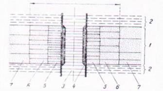 Fig.64. Zonele formate in jurul gaurii de sonda ca urmare a patrunderii filtratului de noroi in stratele poros-permeabile : 1 - strat poros permeabil ; 2 - strat adiacent impermeabil ; 3 - gaura de sonda ; 4 - turta de noroi ; 5 - zona spalata ; 6 - zona de invazie ; 7 - zona necontaminata ; D - diametrul zonei de invazie.