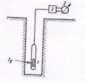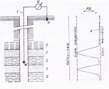 M, N - electrozi de plumb ; G - galvanometru ; 1 - cablu ; 2 - strat impermeabil ; 3 - strat poros - permabil ; 4 - diagrama de P.S.