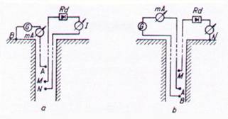 G - generator de curent ; mA - aprat de masura a curentului ; Rd - dispozitiv de redresare a semnalului ; I - aparat inregistrator ; A si B - electrozi de alimentare ; M si N - electrozi de masura.