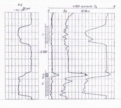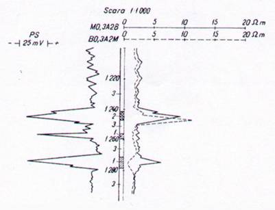 P.S. - potential spontan ; MO, 3A2B - curba potentiala ; BO, 3A2M - curba gradienta ; 1 - nisip cu apa; 2 - nisip cu hidrocarburi; 3 - marna.