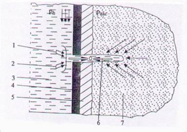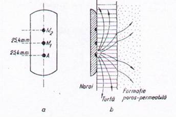 In majoritatea cazurilor, sondele traverseaza o succesiune de strate, unele porors permeabile (nisipuri, gresii, calcare fisurate etc.), iar altele impermeabile (marne, argile, calcare compacte etc.). In timpul procesului de foraj, fluidul de foraj din gaura de sonda exercita o presiune hidrostatica pe fata deschisa a formatiunii, mai mare decat presiunea naturala a acesteia. In dreptul stratelor poros-permeabile are loc fenomenul de filtrare, adica de patrundere in strat a filtratului de noroi (faza lichida separata din fluidul de foraj, compusa din apa in care sunt dizolvate saruri si in care se mai gasesc in suspensie o serie de elemente coloidale). Particolele solide din noroiul de foraj, formate din argila si din elemente de ingreuiere a noroiului se depun pe peretele gaurii de sonda formand turta de noroi sau de colmataj. Ca urmare a patrunderii filtratului de noroi in stratele poros permeabile, in jurul gaurii de sonda se formeaza o serie de zone succesive (fig.64) :
