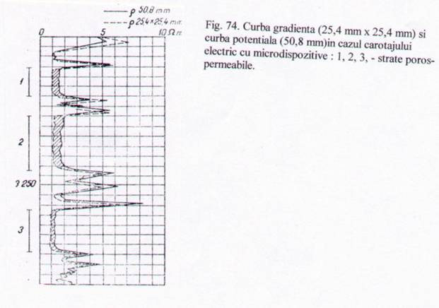 - aprecierea naturii fluidelor continute in rocile colectoare (aceasta se poate face prin compararea celor doua curbe de rezistivitate (la stratele saturate cu apa de zacamant curba gradienta este "cazuta" fata de curba potentiala, in timp ce la stratele cu hidrocarburi, valorile celor doua curbe sunt comparabile sau curba gradienta are o valoare mai mare).