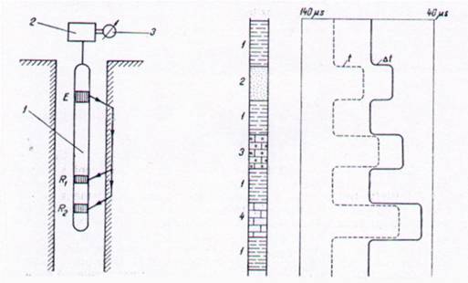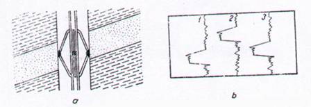 Cele trei microdispozitive vor intersecta pe rand un strat (ce poseda contraste de proprietati electrice fata de rocile adiacente) datorita inclinarii acestuia, astfel ca cele trei curbe inregistrate 1, 2, 3 sunt deplasate una in raport cu cealalta (fig. 89,b).