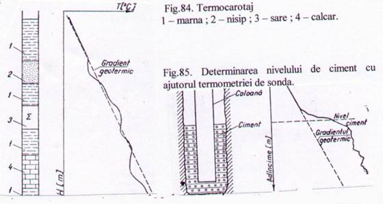 Masurarea temperaturii in sonda se realizeaza cu termometrul de traductori chimici, care transforma variatile de temperatura in variatia unei tensiuni electrice, rezultatul fiind inregistrat pe o termograma. Pe fondul cresterii temperaturii cu adancimea, date de gradientul geotermic, apar o serie de variatii pozitive sau negative datorita campurilor termice locale mentionate (fig.84).