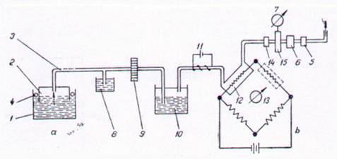 a - degazator; b - analizor de gaze; 1- jgheb cu noroi; 2 - camera degazatorului; 3 - conducta de evacuare; 4 - flotoare; 5 - pompa de vid; 6 - refulator de vid; 7 - manometru; 8 - decantor; 9 - debitmetru; 10 - filtru cu apa; 11 - incalzitor electric; 12 - traductor din fir de platina cu ardere catalitica; 13 - punte cu rezistente; 14 - regulator de viteza; 15 - balon receptor.