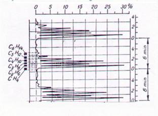 In cea de a doua etapa, cu ajutorul unui detector de gaze (gazoanalizator), ce lucreaza pe principiul arderii catalitice, se determina continutul total de gaze combustibile din amestecul aer-gaze. De asemenea, exista posibilitatea ca utilizand cromatograful, sa se separe componentele gazoase din amestecul aer-gaze, rezultatul analizei cromatografice fiind prezentat in continutul procentului pe diagrama de gazcarotaj (fig.87).