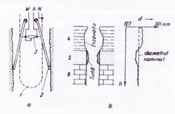 b - curba de cavrernometrie inregistrata intr-un profi de sonda : 4 - marne ; 5 - nisip (gresie) ; 6 - calcar.