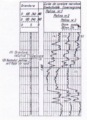 1 - curba de orientare relativa a apratului ; 2 - curba de azimut a gaurii de sonda ; 3 - curba de inclinare a gaurii de sonda ; 4, 5, 6 - curbele de microrezistivitate ; 7 - curba de cavernometrie.