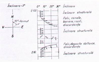 Prelucrarea diagrafiilor se face cu ajutorul unui corelator optic si al abacelor de interpretare sau cu ajutorul calculatorului electronic. Elementele obtinute, unghiul de inclinare al stratului si directia inclinarii, se exprima grafic sub forma unor vectori polari plasati in functie de adancime. Pozitia pe orizontala a originii vectorului, indica unghiul de inclinare, iar orientarea vectorului reprezinta unghiul de directie a inclinarii (fig.91).