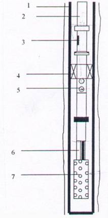 1 - coloana de exploatare; 2 - garnitura de tevi de extractie; 3 - valva de circulatie laterala; 4 - pacher ; 5 - teava de extractie perforata; 6 - cap de aprindere ; 7 - pusca T.C.P.