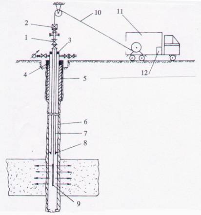 1 - cap de eruptie; 2 - dispozitiv de etansare a cablului de perforare; 3 - dispozitiv de etansare intre tubing si coloana de exploatare a sondei; 4 - dispozitiv de etansare intre coloana de exploatare si coloana de ancoraj; 5 - coloana de ancoraj; 6 - coloana de exploatare; 7 - tevi de extractie; 8 - sabot (siu) ; 9 - aparat de perforare ; 10 - cablu de perforare ; 11 - troliu complex autotransportabil ; 12 - compartiment de producere si transmitere a impulsurilor electrice.
