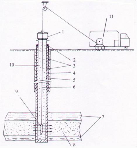1 - prevenitor de eruptie; 2 - dispozitiv de etansare intre coloana de exploatare si coloana de ancoraj; 3 - zona cimentata ; 4 - coloana de ancoraj; 5 - coloana de exploatare; 6 - cablu de perforare ; 7 - strat impermeabil (neproductiv) ; 8 - strat poros permeabil ; 9 - aparat perforator ; 10 - fluid de foraj ; 11 - troliu complex autotransportabil ;