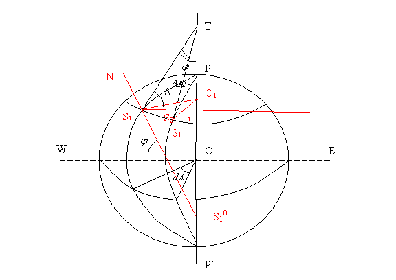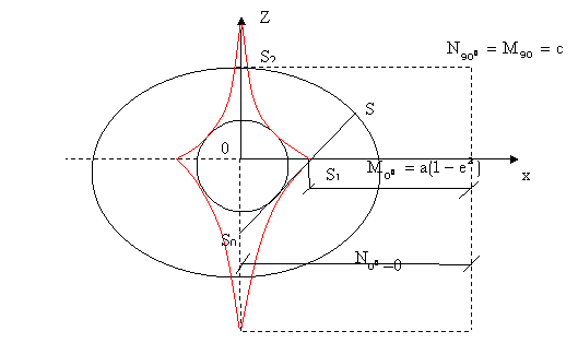 In figura de mai jos se pozitioneaza punctul S pe conturul elipsei meridiene (sectiunea normala principala), se figureaza cercul de paralel al acestuia (sectiunea inclinata) si raza sectiunii normale principale a primului vertical, notata cu N ce reprezinta lungimea arcului SS0. Conform teoremei lui Meusnier se poate calcula marimea razei sectiunii inclinate (care in cazul nostru este raza cercului de paralel al punctului S) in functie de proiectia razei sectiunii normale (sectiunea normala a primului vertical N): r = Ncosφ
