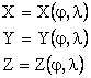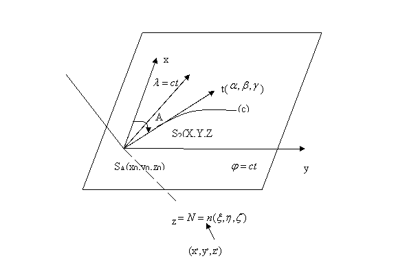 Fie punctele S1 (X0, Y0, Z0) si S2 (X, Y, Z) situate pe curba (c) pe o suprafata curba F la o distanta infinit mica. Curba o identificam cu linia geodezica. Suprafata noastra F este definita implicit de relatia F(X, Y, Z) = 0, iar linia geodezica este definita de ecuatiile parametrice: X = X(s), Y = Y(s), Z = Z(s), deoarece prin deplasarea pe curba punctul s isi schimba parametrii in functie de lungimea, s, a liniei geodezice.