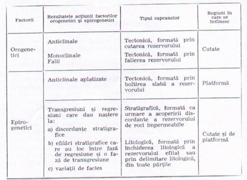 Factorii tectonici (structurali), stratigrafici si litologici, in general, actioneaza simultan si influenta predominanta, in timp, a unuia dintre acestia, detremina tipul capcanei. Influentele factorilor orogenetici si epirogenetici in formarea capcanelor sunt sintetizate in tabelul de mai jos.
