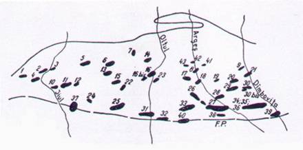Fig.102. Structurile petro-gazeifere si gazeifere din depresiunea Getica : 1 - Bala ; 2 - Tamasesti ; 3 - Targu Jiu ; 4 - Stramba-Rogojelu ; 5 - Colibasi ; 6 - Alunu ; 7 - Valcele ; 8 - Botesti ; 9 - Balteni ; 10 - Ticleni ; 11 - Socu ; 12 - Bustuchini ; 13 - Cazanesti ; 14 - Gradistea ; 15 - Babeni ; 16 bis - Ursi ; 16 - Sapunari ; 17 - Merisani ; 18 - Colibasi ; 19 - Dobresti ; 20 - Draganesti ; 21 - Romanesti ; 22 - Galicea ; 23 - Hurezani ; 24 - Zatreni ; 25 - Cocu-Slatioara ; 26 - Calinesti-Oarza ; 27 - Glambocelu ; 28 - Bogati ; 29 - Ludesti ; 30bis - Strambu ; 30 - Draganu-Calina ; 31 - Otesti ; 32 - Vata ; 33 - Leordeni ; 34 - Cobia ; 35 - Suta-Seaca ; 36 - Bibesti-Bulbuceni ; 37 - Silistea Ciresu ; 38 - Gura Sutii ; 39 - Spineni (Platforma Moesica) ; 40 - Cosesti ; 41 - Baiculesti ; 42 - Tutana.